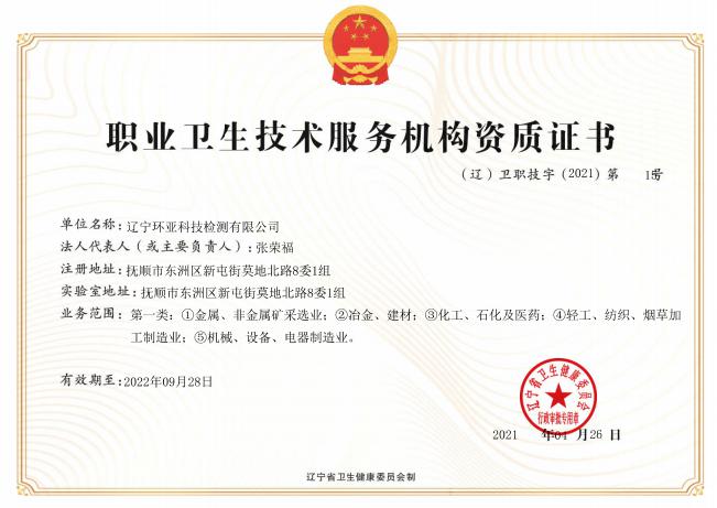 遼寧環亞科技檢測有限公司秉承“公平、公正、客觀、真實”的服務理念,力求為遼寧省各企事業等用人單位提供更優質的服務,公司領導率領全體員工歷時一年零八個月的時間操練各項基本技能,于2016年8月9日取得了(遼)安職技字(2016)第B-0019號《職業衛生技術服務機構資質證書》